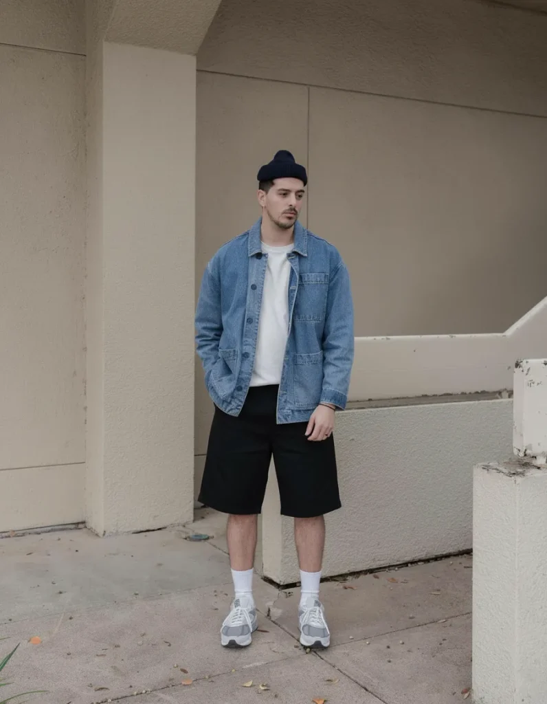 A denim jacket is great for transitional summer weather. Wear it over a plain tee with shorts and retro sneakers for a nostalgic streetwear vibe.