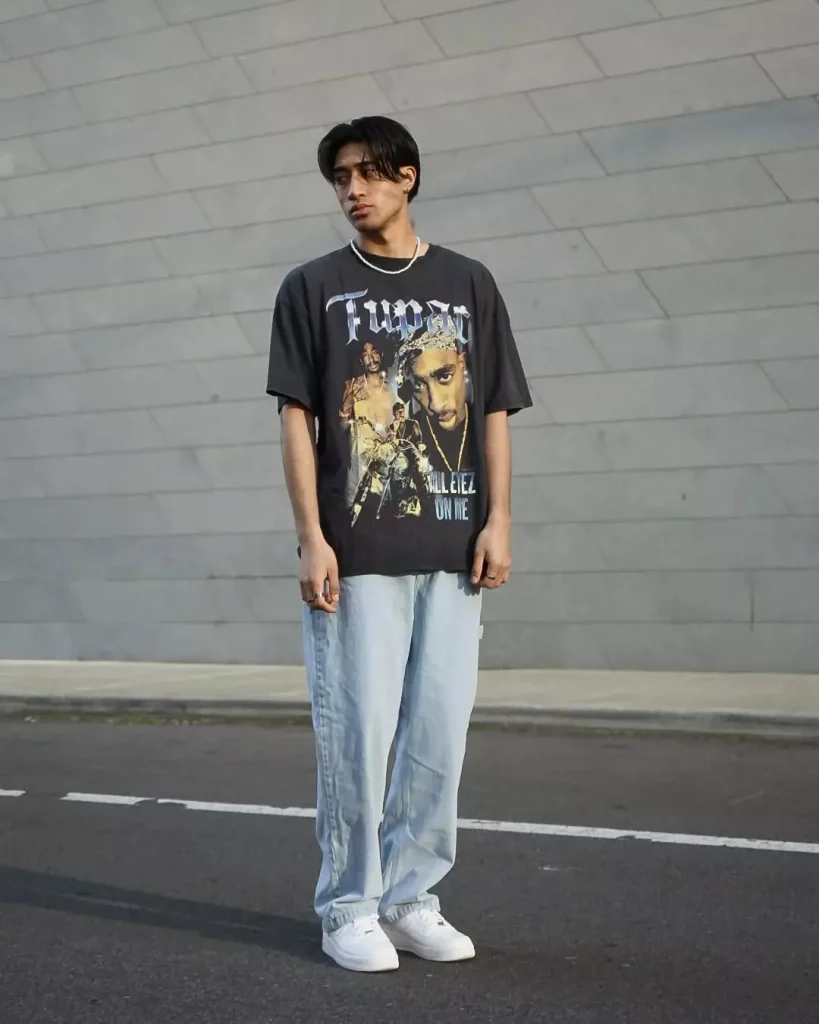A vintage-inspired graphic tee with light-wash denim is an effortlessly cool look. Pair it with white sneakers for a classic touch.