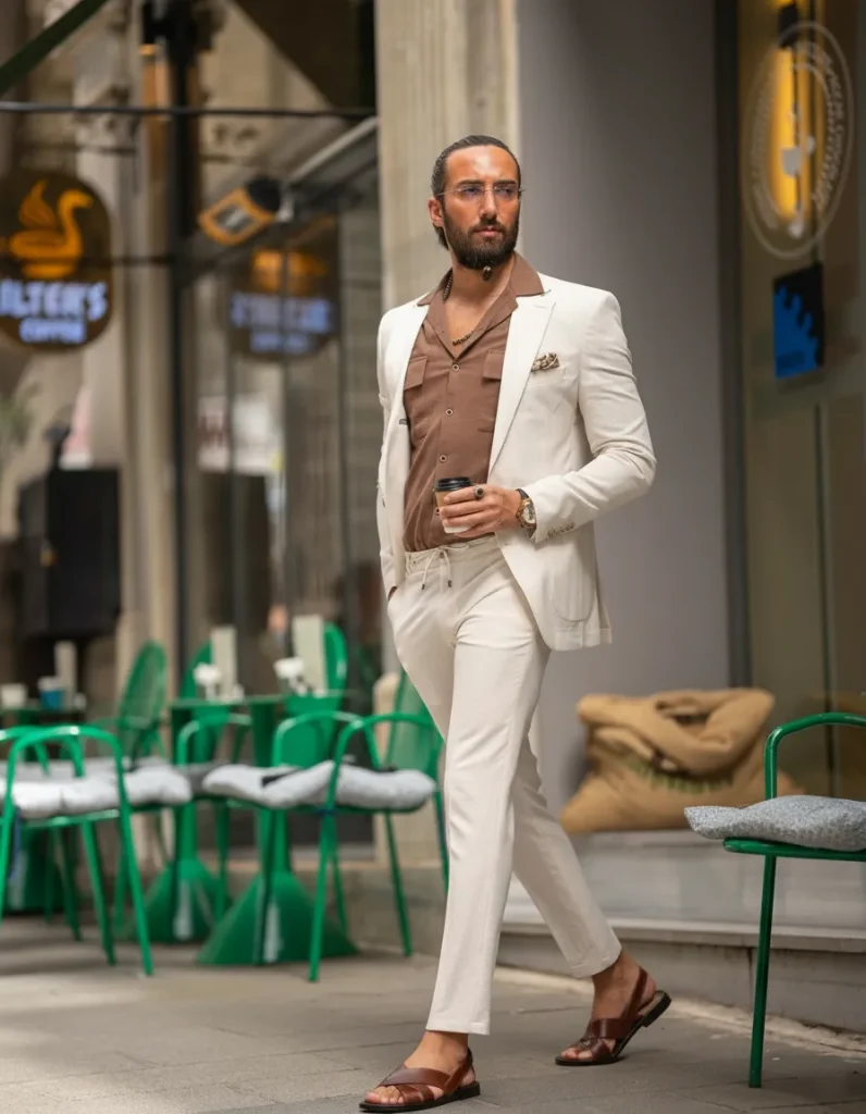 A relaxed-fit summer suit paired with high-quality leather sandals is the ultimate blend of cool and classy.