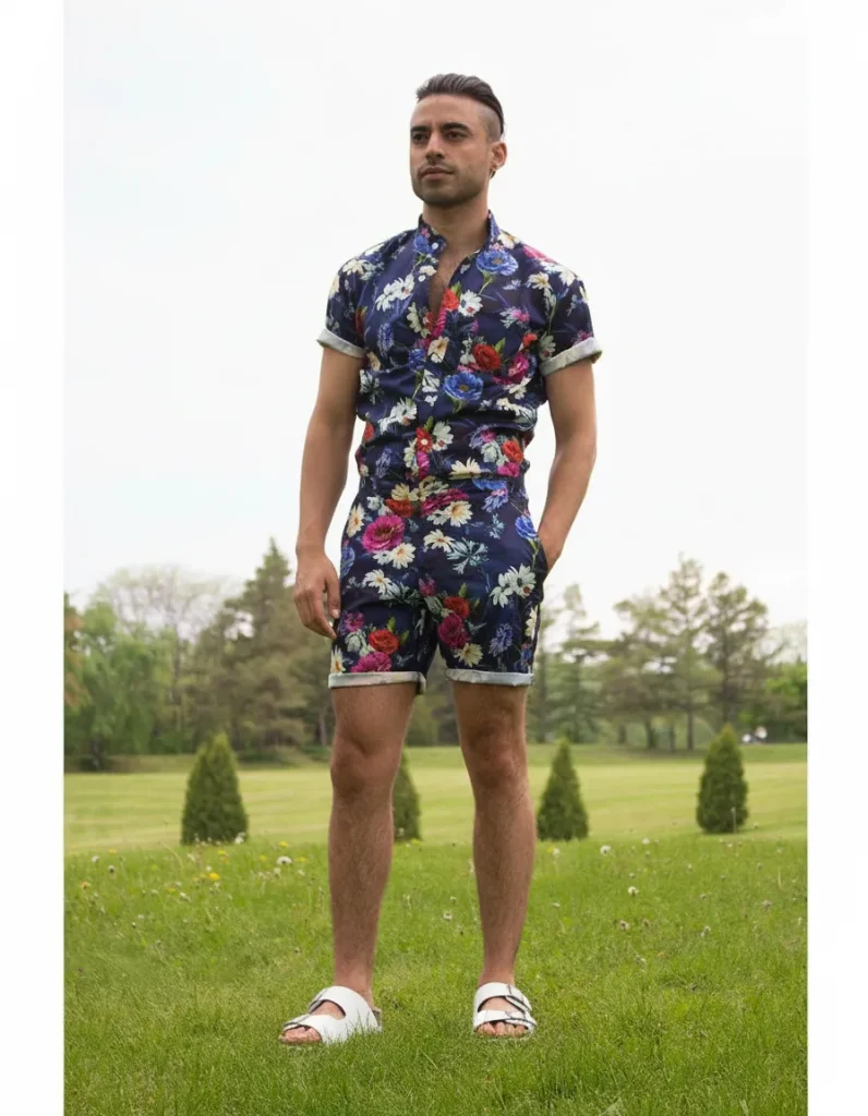 A men’s romper in a neutral shade is an underrated summer staple. Throw on some leather sandals, and you are ready to turn heads.