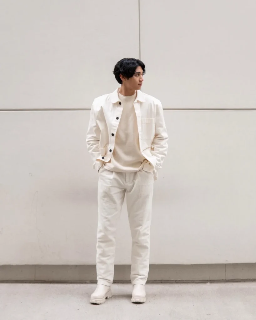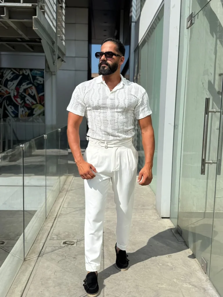 Go for an all-white or all-beige look with layered pieces like a lightweight overshirt or an open linen button-down for added depth.