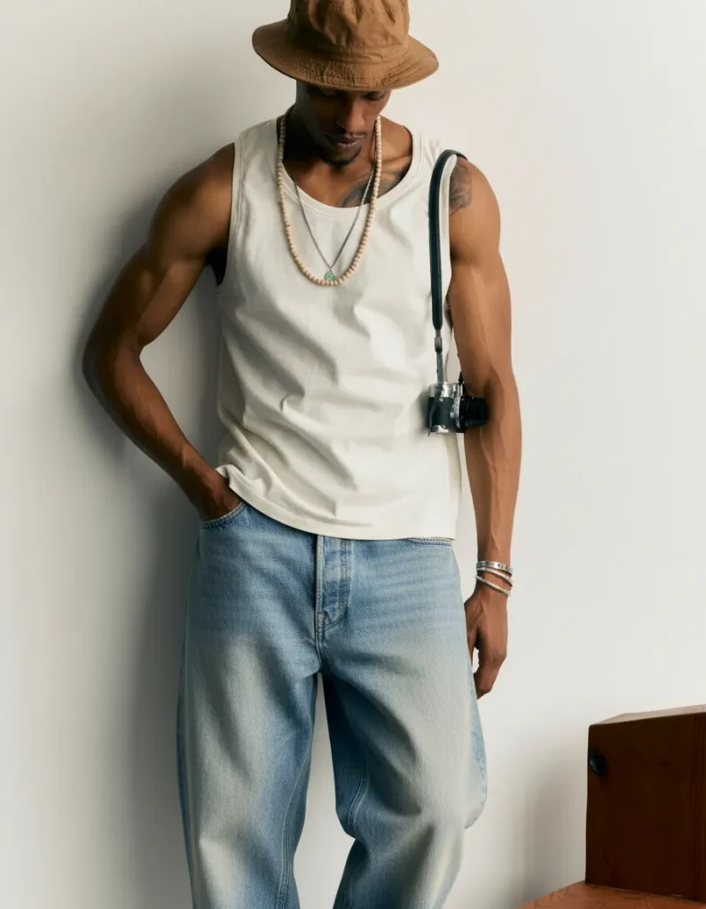 A sleeveless tank paired with baggy jeans is effortlessly stylish. Throw on some statement sneakers to complete the fit.