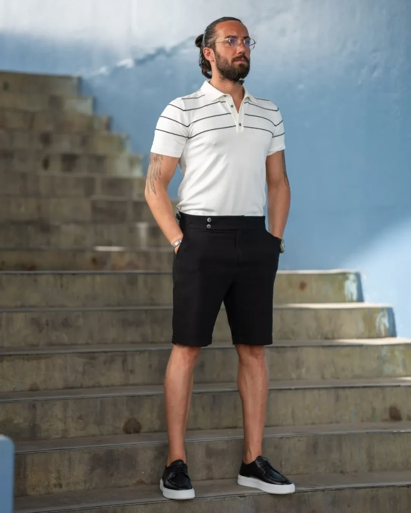 A striped polo tucked into tailored shorts strikes the perfect balance between sporty and polished. Add sunglasses for extra style points.