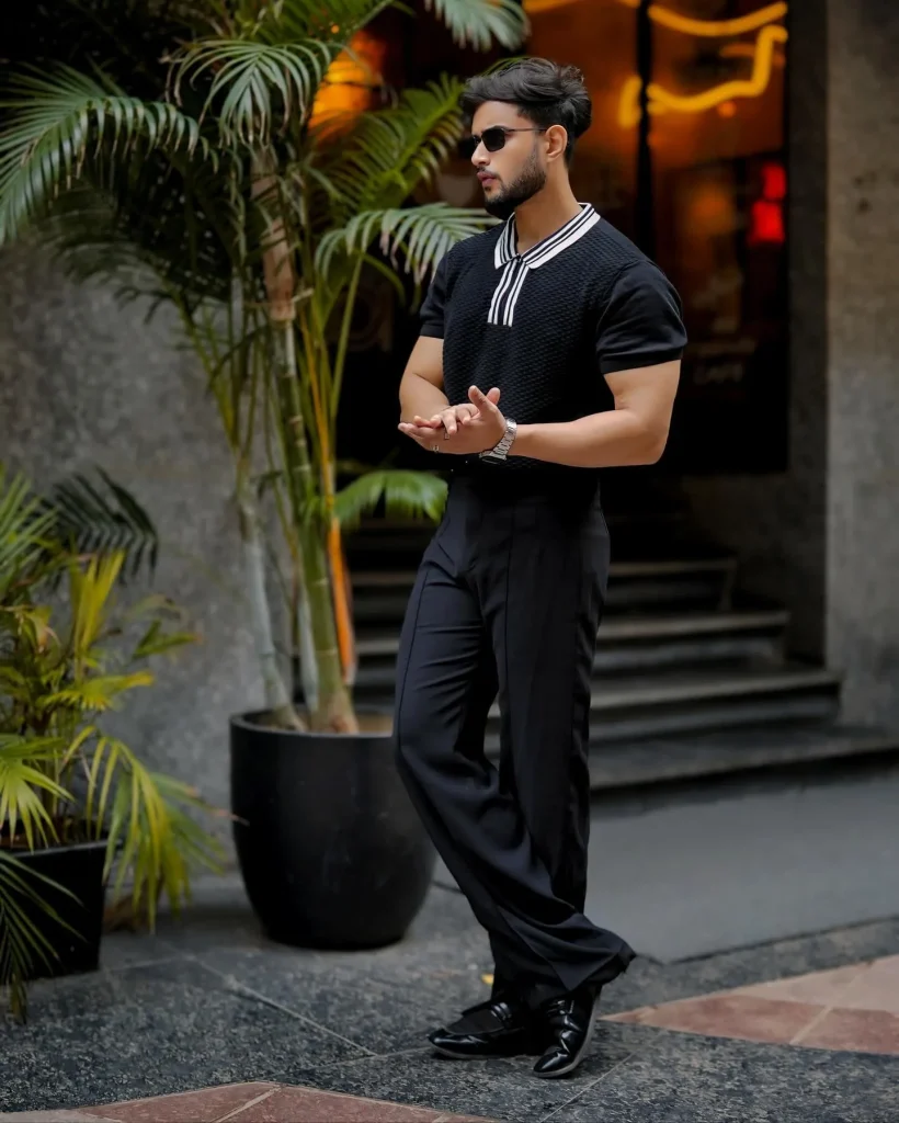 Black is not just for winter. A fitted black tee with lightweight black pants and sleek slides makes for a sharp, minimalist summer outfit.
