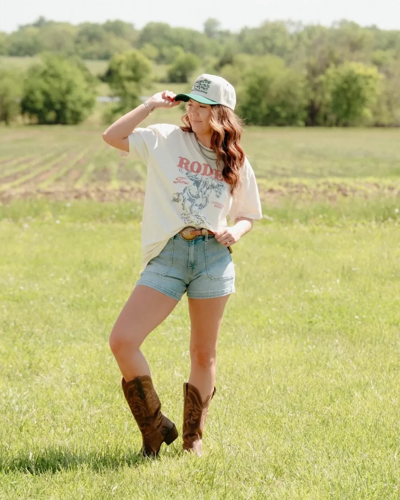 A classic baseball-style tee tucked into distressed shorts is a game-day essential.