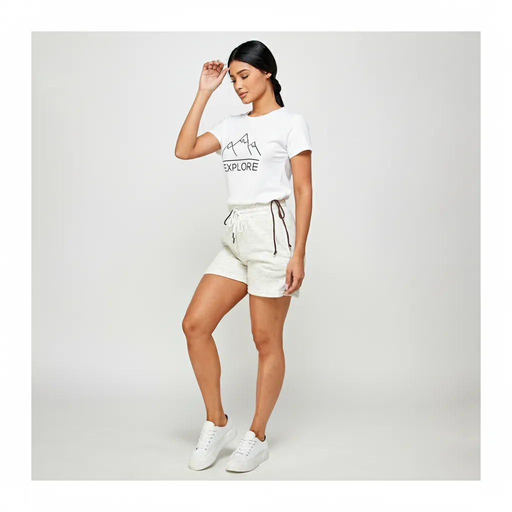 A relaxed fit graphic tee tucked into sweat shorts gives off effortless street-style vibes. Complete the look with crew socks and sneakers.
