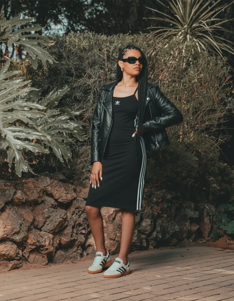 A tube top with classic Adidas-style track pants is the perfect mix of casual and trendy. Add statement earrings for an elevated touch.