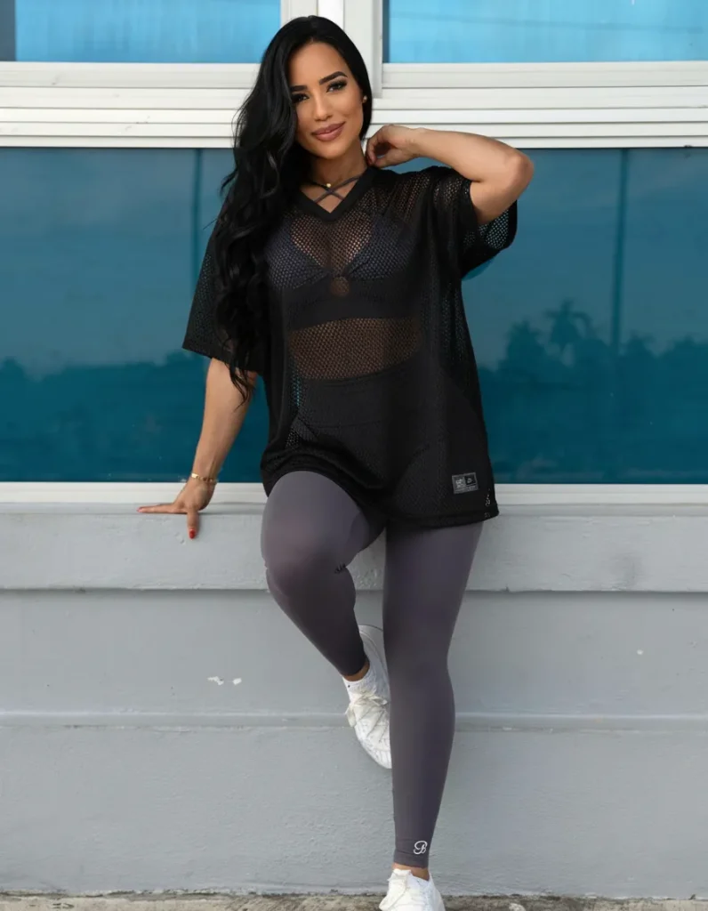 A mesh jersey layered over a sports bra with high-waisted leggings is both breathable and stylish. Perfect for warmer game days.