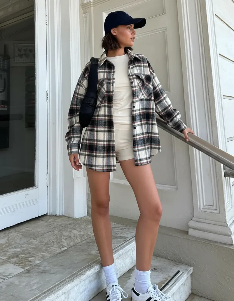 For a relaxed yet put-together look, throw an oversized flannel over a fitted tee and shorts.