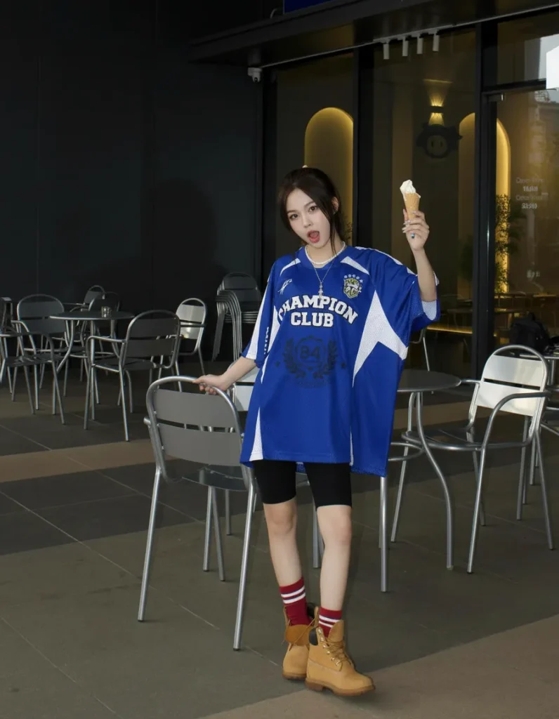 The ultimate soccer game staple. Pair an oversized jersey with biker shorts and white sneakers for a relaxed yet trendy look.