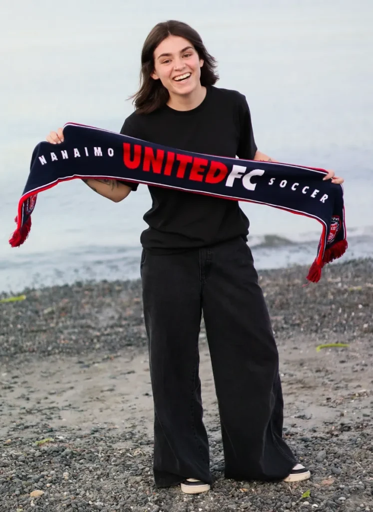 Go for a sleek all-black look and let a bold soccer scarf add a pop of color and team spirit.