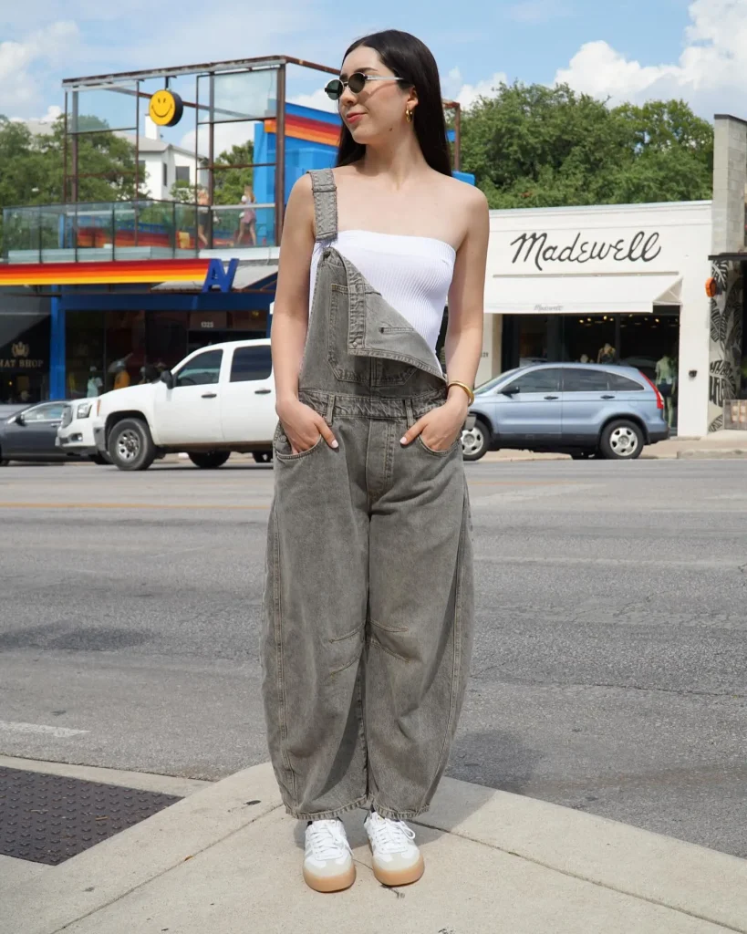 Denim overalls worn over a fitted tube top create a cool, casual stadium-ready look.