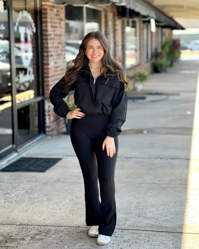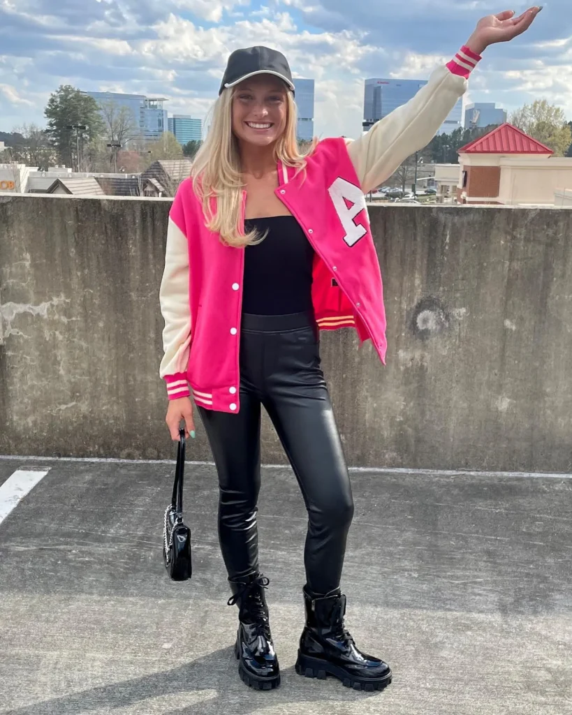 A lightweight varsity jacket over leggings creates the perfect blend of sporty and stylish. Finish the look with sleek sneakers.