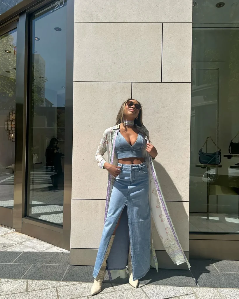 A denim corset top paired with baggy jeans is giving peak 2000s energy. Finish with mini sunglasses and a baguette bag.