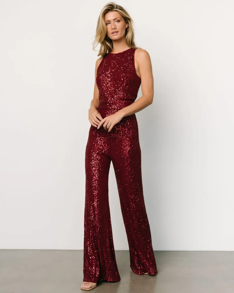 A full-body glitter jumpsuit is a major power move. Cinch the waist with a statement belt and add bold earrings.