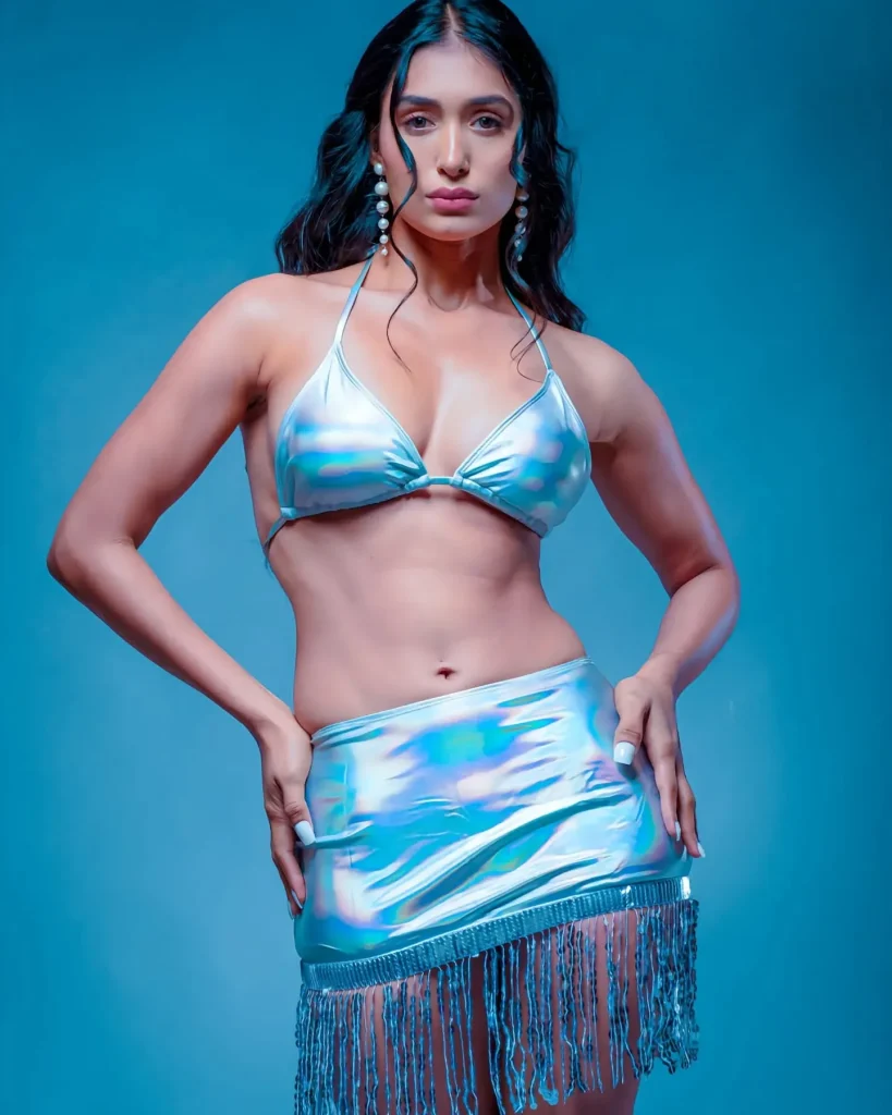 Metallics and holographic fabrics will have you looking like a futuristic queen. Go for a two-piece set with a mini skirt or biker shorts.