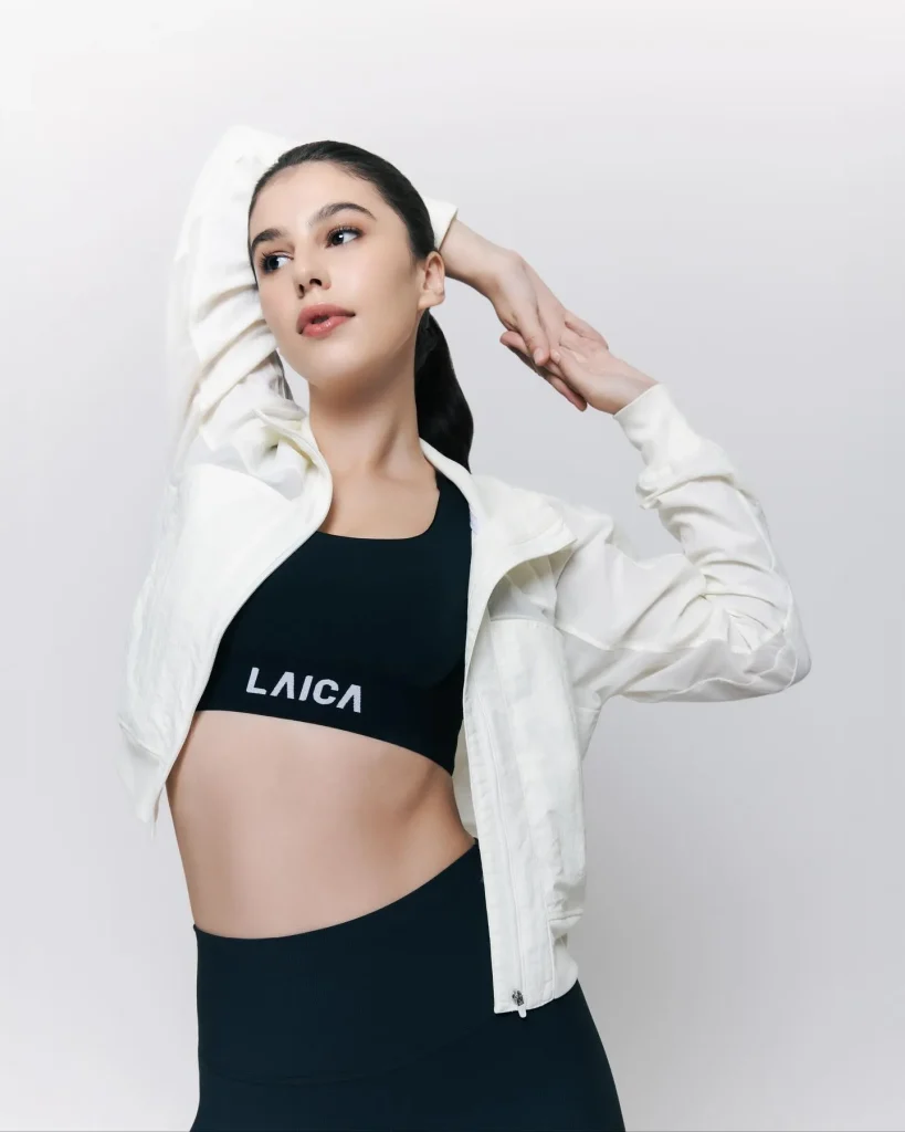 A reflective or iridescent jacket over a sports bra and biker shorts is a bold street-style look that catches the light at every angle.