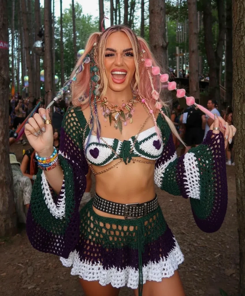 A crochet set becomes even more festival-ready when styled with a studded belt and layered necklaces.