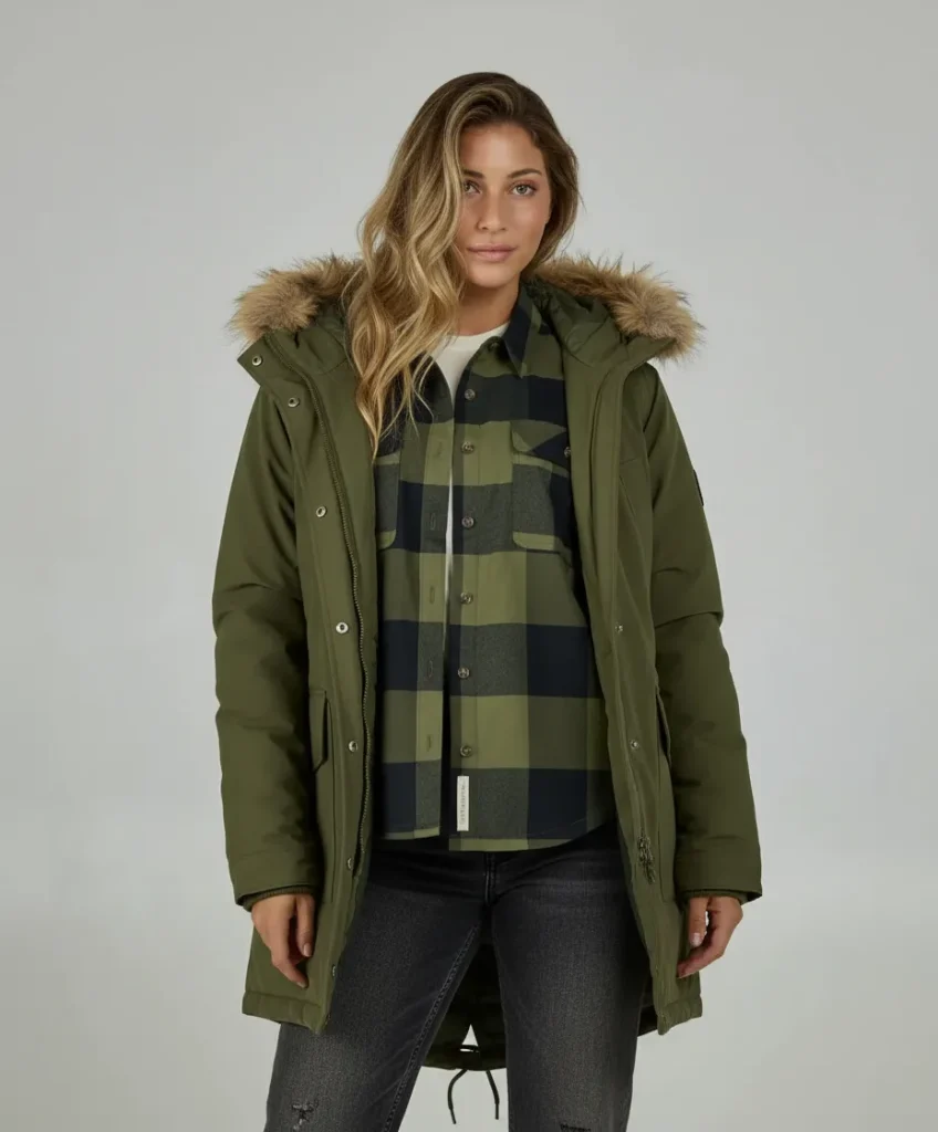 • Texture & Color Play: The soft, brushed cotton of the flannel, the sturdy twill of the denim, and the technical or canvas fabric of the parka create a trio of rugged textures. The plaid pattern adds color and visual interest.
