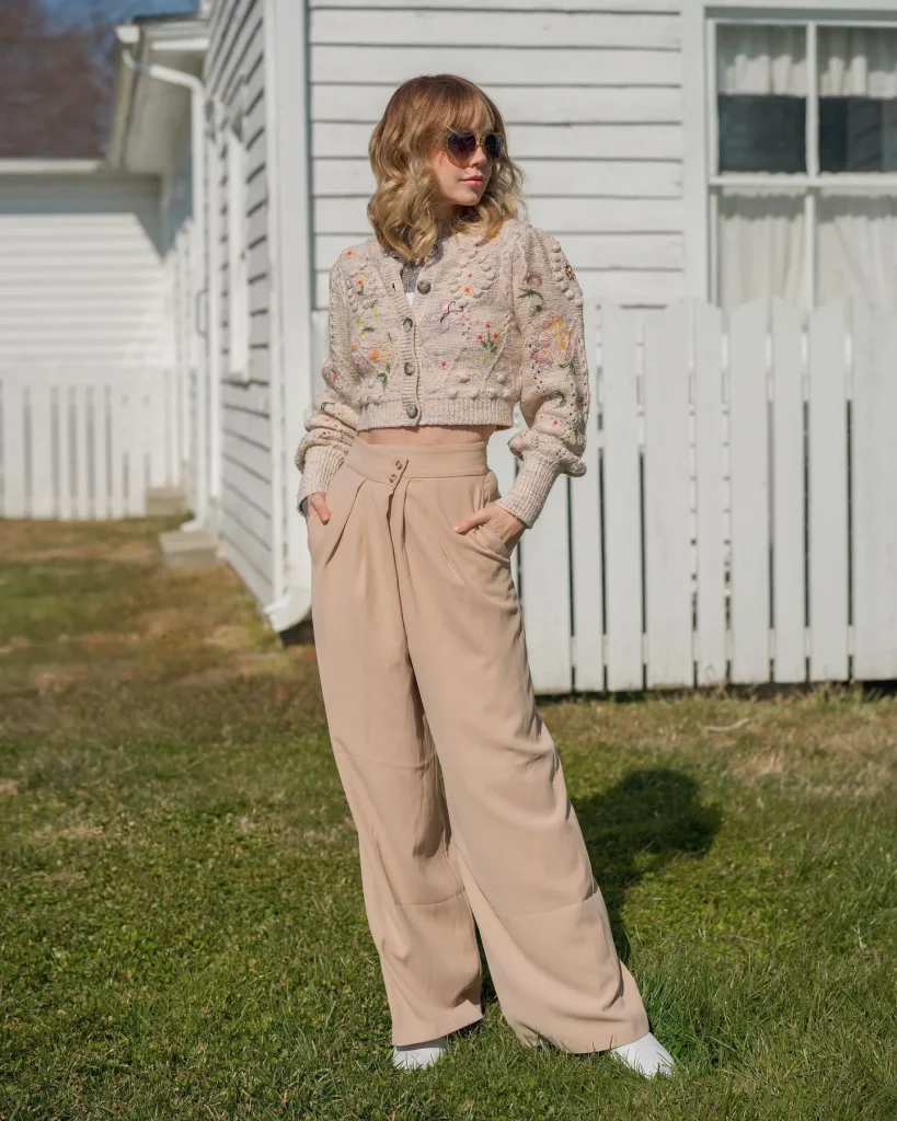• The Formula: A blouse with a fun print, layered under a solid-colored Cropped Sweater (so the blouse collar and hem peek out), paired with high-waisted Wide-Leg Trousers.
