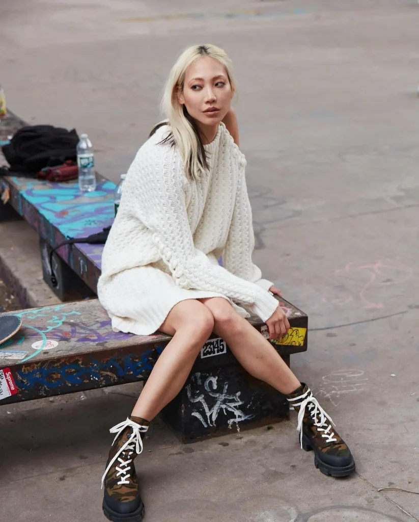 • Silhouette & Balance: Choose a sweater dress that skims the body rather than clings too tightly. The chunky sole of the combat boots provides a solid, grounding base for the soft silhouette of the dress.