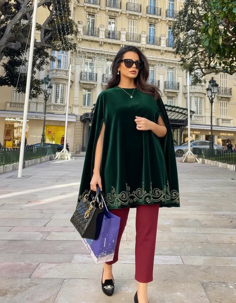 - Festive Vibe: A cape adds an element of high-fashion drama and sophistication. It’s an unexpected and elegant choice that provides coverage while still feeling incredibly stylish.