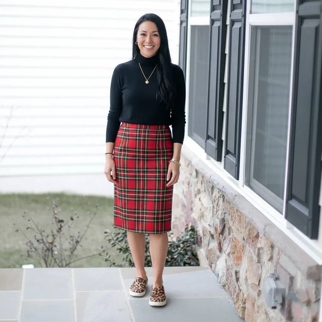 - The Look: A classic Plaid or Tartan Midi Skirt paired with a simple black turtleneck.