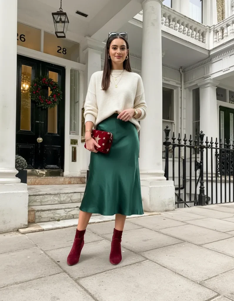 - Color Palette: Try a monochromatic look (like a cream sweater with a champagne skirt) or a festive pairing (like a winter white sweater with a burgundy or emerald skirt).