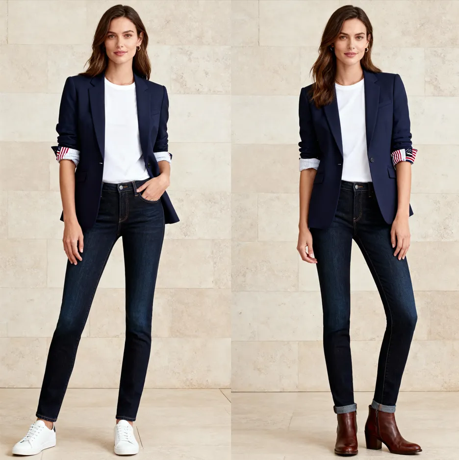 - Why It Works: This outfit masters the art of balance. The blazer adds structure and a touch of formality, while the tee and jeans keep it grounded and casual. The navy, white, and denim blue create a subtle patriotic color story without being overt.