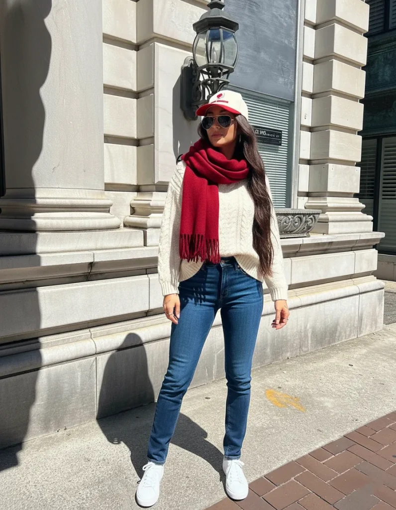 - The Core Pieces: A chunky cream or white cable-knit sweater, straight-leg blue jeans, and a pop of color with a burgundy or deep red scarf.