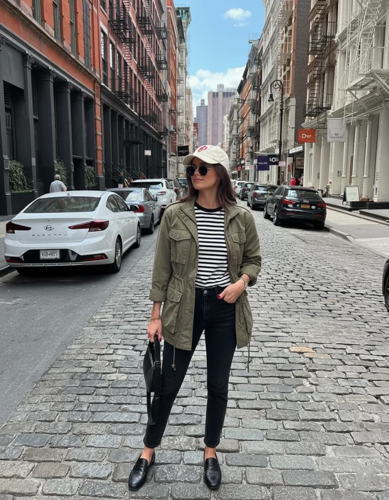 - Why It Works: The utility jacket provides a respectful and thematic anchor for the outfit. Pairing it with classic stripes and black denim keeps the look from being too literal, making it feel chic and contemporary. It’s a sophisticated take on a military-inspired silhouette.