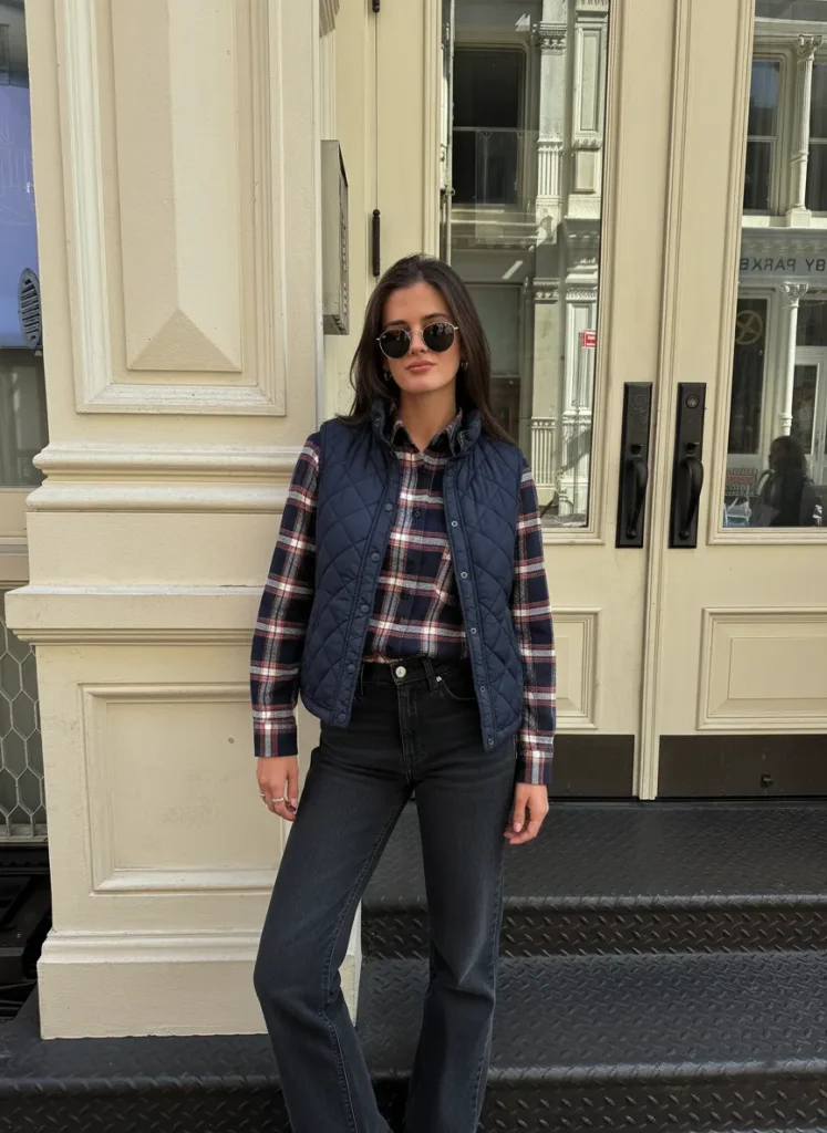 - The Core Pieces: A flannel shirt in a navy, red, and white plaid pattern, dark-wash jeans, and a navy quilted vest.