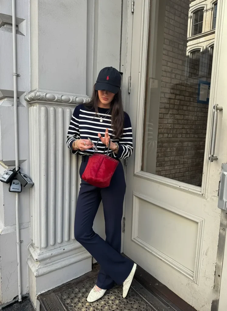 - Why It Works: The Breton stripe is a timeless classic with maritime roots, making it a fitting choice. Paired with dark, tailored trousers, the silhouette is clean and sophisticated. The single pop of red provides an intentional, high-impact accent.