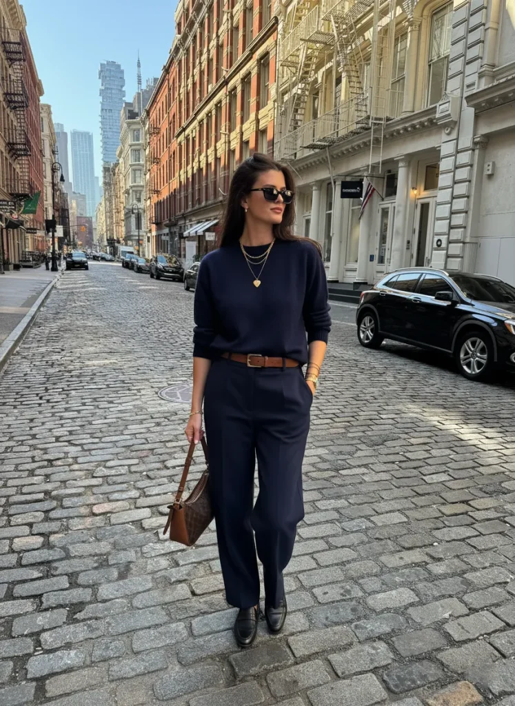 - The Core Pieces: A head-to-toe navy look think a navy cashmere sweater paired with navy wide-leg trousers or dark denim.