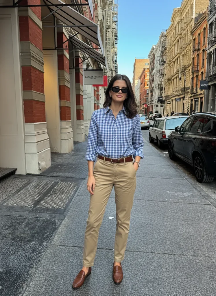 - The Core Pieces: A blue-and-white gingham button-down shirt, classic khaki chinos, and a brown leather belt.